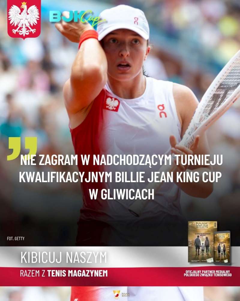 „Dzisiaj chcę się podzielić kolejną decyzją. Nie zagram w nadchodzącym turnieju kwalifikacyjnym Billie Jean King Cup w Gliwicach. Nie jest to dla mnie łatwe, bo granie w Polsce zawsze miało i ma dla mnie wyjątkowe znaczenie i wiem, że wielu z Was czekało, żeby zobaczyć mnie na korcie. Ostatni czas jest dla mnie wymagający – zarówno sportowo, jak i pod względem zmian, które dzieją się wokół mnie. Czuję, że potrzebuję chwili, żeby się zatrzymać, poukładać pewne rzeczy, a także skupić się na spokojnej, jakościowej pracy. Mam nadzieję, że to rozumiecie. Mamy świetny zespół – jestem pewna, że Magda Linette jako jego liderka wspaniale poprowadzi dziewczyny. Trzymam mocno kciuki za cały skład: Lindę Klimovicovą, Katarzynę Kawę, Maję Chwalińską, kapitan Dawid Celt oraz cały zespół. Będę Wam kibicować z całego serca. Dziękuję również za Wasze wsparcie” – ono naprawdę wiele dla mnie znaczy” – poinformowała Świątek na swoim oficjalnym profilu na Instagramie.