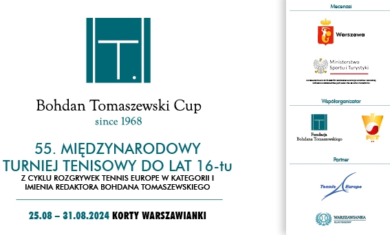 W poniedziałek 26 sierpnia, o godz. 18 na dolnych kortach Klubu Tenisowego Warszawianka (od ul. Piaseczyńskiej) zaplanowano uroczyste otwarcie 55. już edycji Bohdan Tomaszewski Cup, turnieju kategorii 1. w cyklu Tennis Europe U16 (25-31 sierpnia). To jedna z najstarszych imprez w tenisie młodzieżowym w Polsce i prawdziwa “kuźnia talentów”, której patronem jest nieżyjący już redaktor Bogdan Tomaszewski.