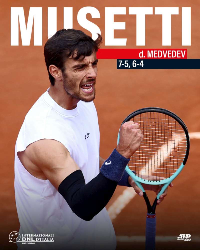 Bardzo wyrównany był również mecz, w którym Włoch Lorenzo Musetti (9. WTA) zmierzył się z Daniiłem Miedwiediewem (11. ATP), ale tego można się było spodziewać, rywalizowali przecież tenisiści, których w rankingu ATP dzielą zaledwie dwie lokaty. Minimalnie lepszy okazał się tenisista włoski zwyciężając w dwóch setach 7:5, 6:4.