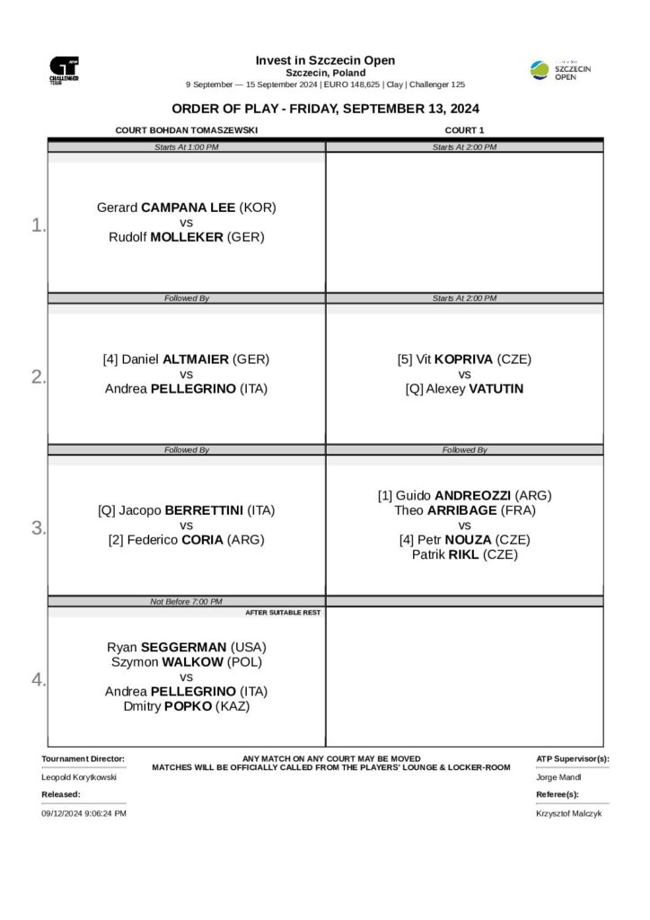 W piątek zostaną rozegrane ćwierćfinały gry pojedynczej oraz półfinały debla. W meczu dnia nie przed godziną 19:00 Szymon Walków i Ryan Seggerman zagrają o udział w sobotnim finale.