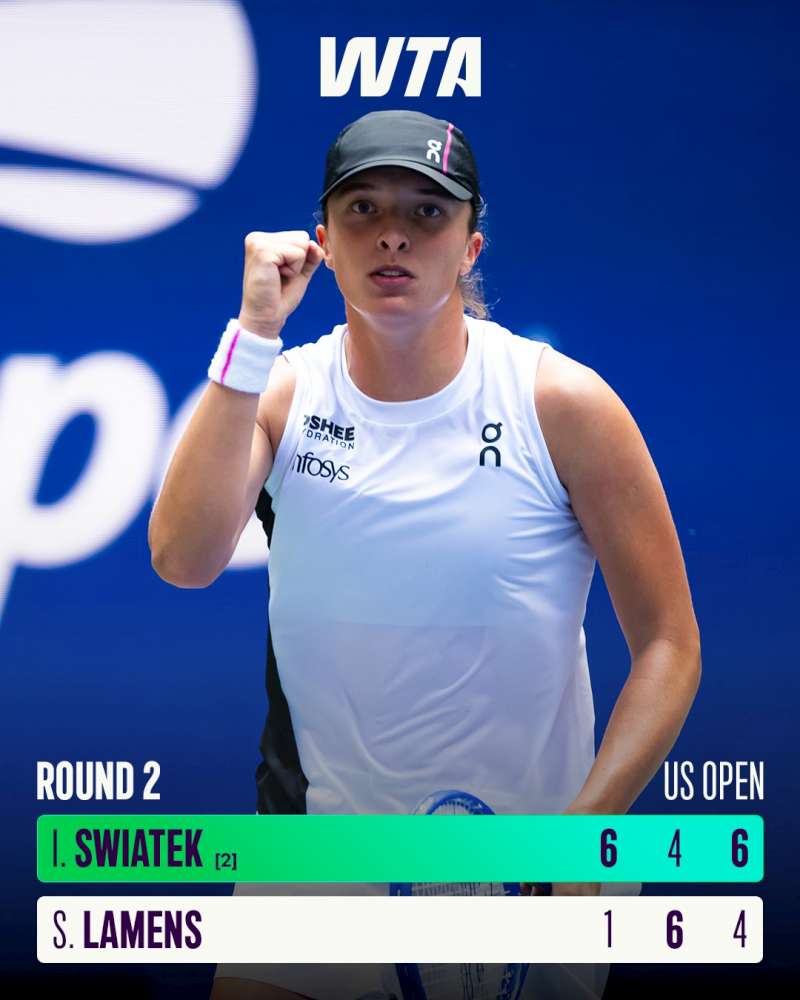 Iga Świątek, wiceliderka rankingu WTA tenisistek, pokonała – po niełatwym spotkaniu – 6:1, 4:6, 6:4 Holenderkę Suzan Lamens (66. WTA) i awansowała do trzeciej rundy wielkoszlemowego US Open 2025 rozgrywanego na kortach USTA Billie Jean King National Tennis Center na terenie Flushing Meadows Corona Park w Nowym Jorku. Mecz trwał dwie godziny i siedem minut. To był pierwszy pojedynek obu tenisistek w zawodowym tourze i jednocześnie 51. zwycięstwo reprezentantki Polski w sezonie 2025. W kolejnej rundzie rywalką Świątek będzie rosyjska tenisistka Anna Kalinskaja.